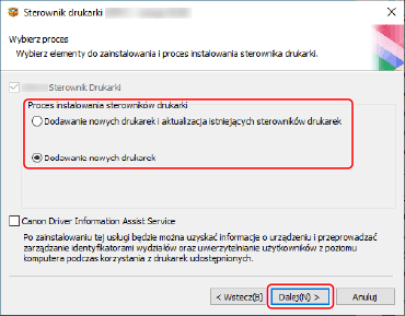 [Canon Driver Information Assist Service]: wybierz tę opcje, aby korzystać z funkcji uzyskiwania informacji o urządzeniu.