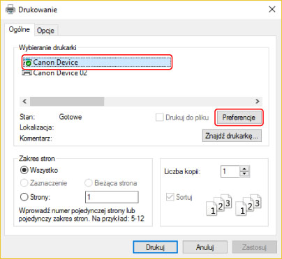 W zależności od aplikacji [Preferencje] może mieć nazwę „Właściwości drukarki” lub „Właściwości”.