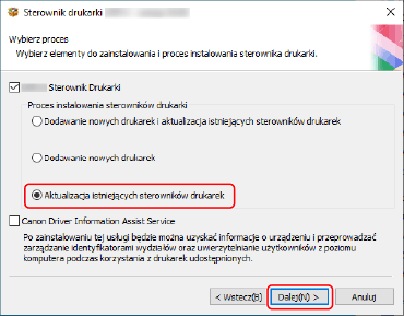 Wybierz pozycję [Aktualizacja istniejących sterowników drukarek] w obszarze [Proces instalowania sterowników drukarki] → kliknij przycisk [Dalej].