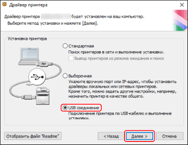 (4) Если отображается экран [Выбор типа соединения], выберите [USB-соединение] → щелкните [Далее].