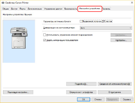 Благодаря этим настройкам драйвер может использовать функции устройства для правильного выполнения печати.