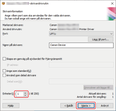 När du klickar på [Nästa] aktiveras ändringen i [Enheter] för [Aktuell skrivare] och [Antal skrivare för omgång].