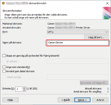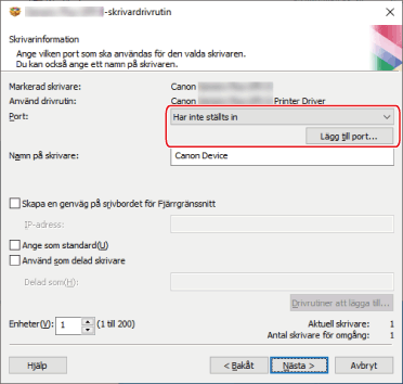 Om du har valt en nätverksskrivarport kan du inte ange [Namn på skrivare] och [Använd som delad skrivare].
