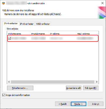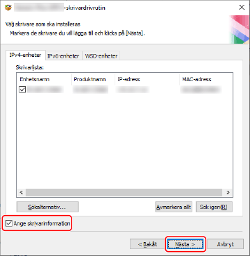Du kan söka efter enheter på TCP/IP-nätverk när du installerar drivrutinen.