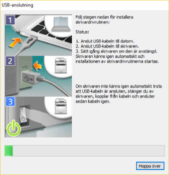 När följande skärm visas ansluter du skrivaren till datorn med en USB-sladd → slå på skrivaren.