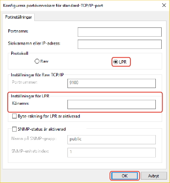 (1)Välj [LPR] för [Protokoll] → ange en av utskriftsköerna för [Könamn] i [Inställningar för LPR].