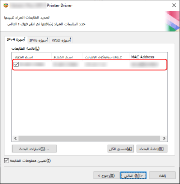 علامة التبويب [أجهزة IPv4]/[أجهزة IPv6]/[أجهزة WSD]: يتم عرض نتائج البحث في الورقة المناظرة لطريقة اتصال الجهاز. انقر على الورقة للانتقال إليها.