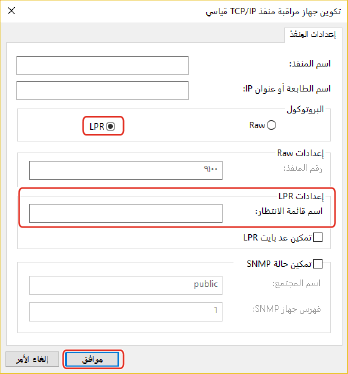 (1) اختر [LPR] لـ [البروتوكول] ← حدد إحدى قائمات انتظار الطباعة [اسم قائمة الانتظار] في [إعدادات LPR].