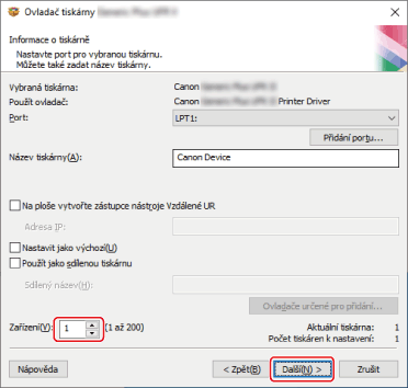 Po kliknutí na [Další], se změna na [Zařízení] použije na zařízení [Aktuální tiskárna] a [Počet tiskáren k nastavení].