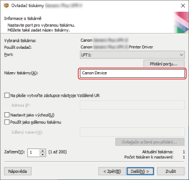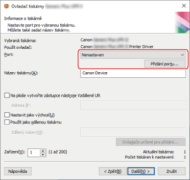 Pokud jste vybrali port síťové tiskárny, nelze nastavit [Název tiskárny] a [Použít jako sdílenou tiskárnu].
