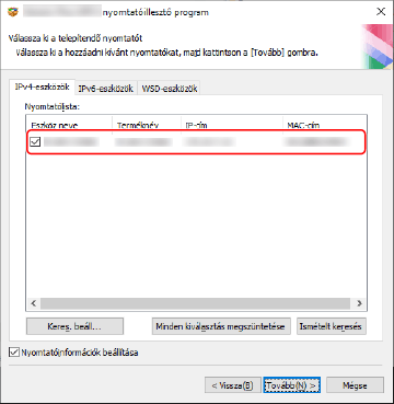 [IPv4-eszközök]/[IPv6-eszközök]/[WSD-eszközök] fül: A keresési eredmények az eszköz kapcsolódási módjának megfelelő lapon jelennek meg. Megnyitásához kattintson az egyik lapra.