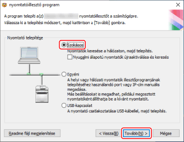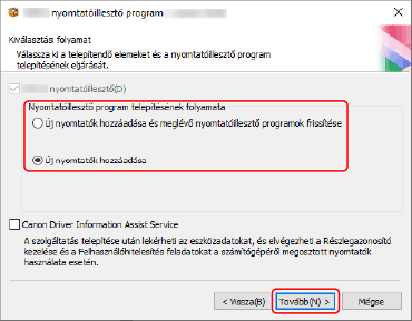 [Nyomtatóillesztő program telepítésének folyamata]: Szükség esetén válassza ki ezt a lehetőséget, ha már van telepítve illesztőprogram.