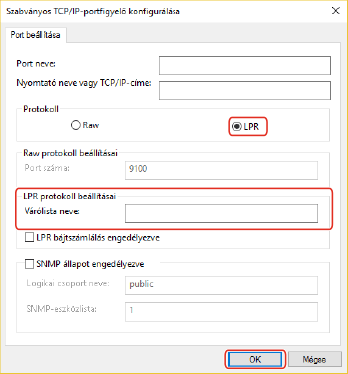 (1) Válassza az [LPR] lehetőséget a [Protokoll] menüpontban → adja meg a nyomtatási sorok valamelyikét az [Várólista neve] [LPR protokoll beállításai] beállításnál.