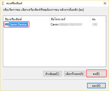 เลือกชื่อของอุปกรณ์ที่คุณต้องการถอนการติดตั้ง → คลิก [ลบ]