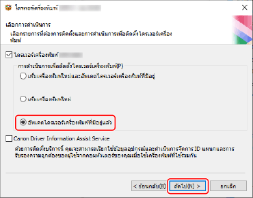 เลือก [อัพเดตไดรเวอร์เครื่องพิมพ์ที่มีอยู่แล้ว] ที่ [การดำเนินการเพื่อติดตั้งไดรเวอร์เครื่องพิมพ์] → คลิก [ถัดไป]