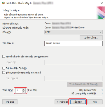 Khi bạn nhấp vào [Tiếp], thay đổi thành [Thiết bị] sẽ được áp dụng cho [Máy In Hiện Thời] và [Số Lượng Máy In để Đặt].