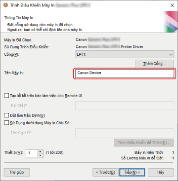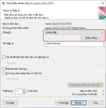 Nếu bạn đã chọn cổng máy in mạng, bạn không thể cài đặt [Tên Máy In] và [Sử Dụng dưới dạng Máy In Chia Sẻ].