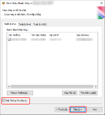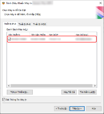 Thẻ [Thiết Bị IPv4]/[Thiết Bị IPv6]/[Thiết Bị WSD]: Kết quả tìm kiếm được hiển thị trên tờ tương ứng với phương pháp kết nối của thiết bị. Nhấp vào tờ để chuyển sang nó.