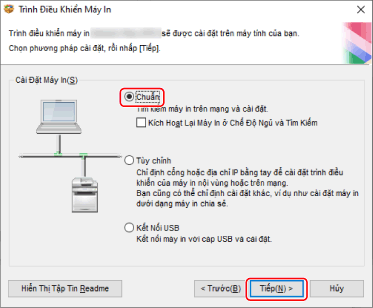 [Tìm Kiếm Lại]: Nhấp vào đây nếu thiết bị không được hiển thị trong [Danh Sách Máy In]. Nếu thiết bị vẫn không được hiển thị sau khi tìm kiếm lại, hãy chọn [Tùy chỉnh] và cài đặt bằng việc chỉ định cổng hoặc địa chỉ IP.