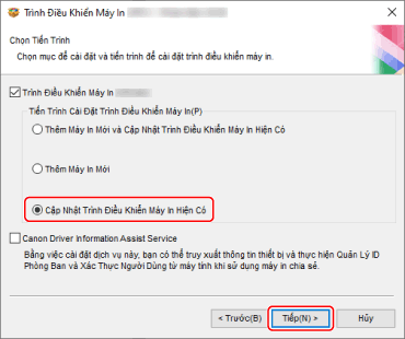 Chọn [Cập Nhật Trình Điều Khiển Máy In Hiện Có] cho [Tiến Trình Cài Đặt Trình Điều Khiển Máy In] → nhấp vào [Tiếp].