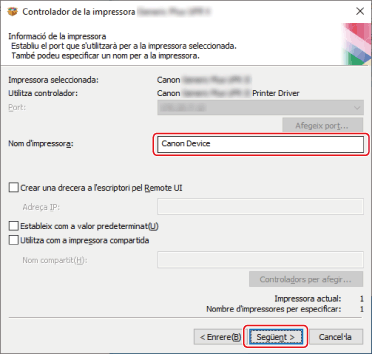 Si voleu canviar el nom del dispositiu, o configurar-lo com a dispositiu predeterminat, seleccioneu [Estableix informació de la impressora] → feu clic a [Següent].