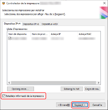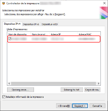 Seleccioneu el dispositiu que voleu instal·lar a la [Llista d'impressores].