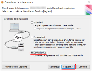 Seleccioneu [Connexió USB] → feu clic a [Següent].
