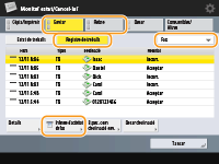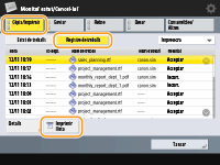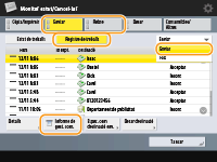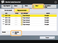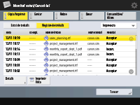 (Monitor estat/Cancel·lar), es mostra la pantalla Monitor estat/Cancel·lar, que us permet comprovar l'historial d'ús de cada funció, com ara còpia, impressió, enviament de correu electrònic, enviament o recepció de faxos/I-faxos, emmagatzematge de fitxers a "Espai avançat", etc. Des d'aquesta pantalla també podeu imprimir l'historial d'ús de cada funció.