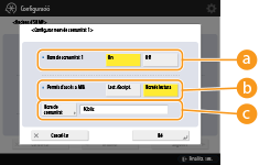 La comunitat exclusiva és una comunitat (grup) preparada per als administradors que utilitzen programari de Canon, com ara iW Management Console. Per utilitzar la comunitat exclusiva, premeu <Establir comunitat dedicada>. Per especificar una comunitat general, premeu <Configurar nom de comunitat 1> o <Configurar nom de comunitat 2>.