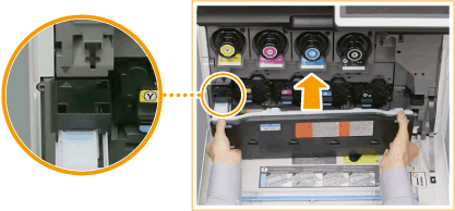 Ved udskiftning af beholderen til overskudstoner vises proceduren også på skærmbilledet. Kontrollér de oplysninger, der vises på skærmen, og udfør også følgende procedure.