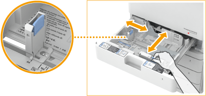 Stel de linker geleider en de voorste geleider in volgens de formaatindicators voor het te plaatsen papier door elke geleider te verschuiven terwijl u op het bovenste gedeelte van die geleider drukt.