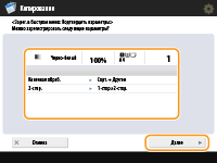 Если выбрать значение <Вкл.> для параметра <Запустить вызываемую операцию (Операция запускается при нажатии кнопки.)>, то копирование запустится сразу после нажатия соответствующей кнопки на экране Быстрое меню (нажимать клавишу  (Пуск) при этом не требуется). Если необходимо, чтобы копирование запускалось вручную путем нажатия клавиши  (Пуск) выберите значение <Выкл.>.