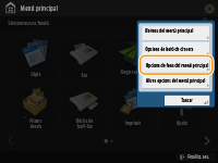 El Menú principal és la pantalla d'inici per a les funcions. Tot i que el Menú principal està configurat per a un ús senzill en el moment de la compra, podeu personalitzar-lo perquè s'ajusti millor a les vostres operacions diàries. Per personalitzar el Menú principal, heu d'iniciar sessió amb privilegis d'administrador. Inici de sessió a l'equip