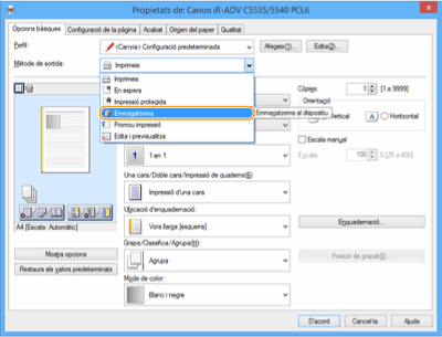 Hi ha dues maneres de desar originals a la bústia: llegint-los amb l'equip i enviant els fitxers d'un ordinador des de la impressora. Les opcions d'impressió estan desades conjuntament amb els documents desats des d'un controlador d'impressora, permetent sempre imprimir-los amb els mateixos acabats, així us estalvieu haver de configurar les opcions cada vegada.