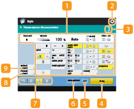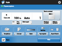 Zde se zobrazuje stav nastavení, např. poměr kopírování, velikost papíru, počet kopií atd. V zájmu správného zhotovení kopií nastavení zde vždy zkontrolujte. Chcete-li nastavení změnit, stiskněte tlačítko pod zobrazením. Základní operace kopírování