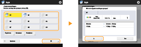 Als de bovenstaande berichten worden weergegeven bij het registreren van <Favorieteninstellingen> voor <Scannen en verzenden>, voert u de volgende handelingen uit. Als u favoriete instellingen wilt oproepen zonder een wachtwoord in te voeren, drukt u op <Ja> om de wachtwoordinformatie te bewaren.