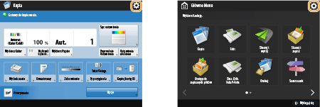 Naciśnij ikonę  wyświetlaną na ekranie Główne Menu oraz ekranie Podstawowych funkcji, aby dostosować ekran do własnych potrzeb, np. zmienić układ przycisków lub utworzyć skróty. Tylko administrator może dostosowywać wygląd ekranu głównego menu. Dostosowywanie ekranu dotykowego do własnych potrzeb