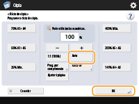 Quando o ecrã para selecionar o formato do original for apresentadoSe <Selecionar papel> estiver programado para <Auto>, o ecrã para selecionar o formato do original poderá ser apresentado. Isso deve-se ao facto de não ser possível verificar o formato do original e de não ser possível selecionar o papel automaticamente quando são colocados originais muito transparentes, originais com uma cor base extremamente escura ou originais de formato pequeno. Selecione o formato do original ou um formato semelhante ao do original.