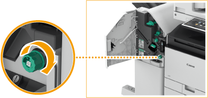 Rode o manípulo verde para enviar o papel encravado para o lado do tabuleiro principal.