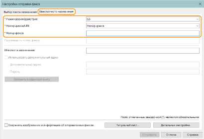 Щелкните вкладку [Ввести место назначения] и укажите используемые режим связи и номер факса.