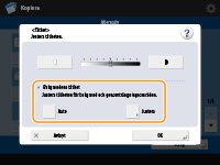 När skärmen för att välja originalets format visasOm <Välj papper> är inställt på <Auto> kanske skärmen för att välja originalets format visas. Den visas eftersom originalets format inte kan verifieras och papper inte kan väljas automatiskt när original av hög transparens, original med extremt mörk bakgrundsfärg eller liten storlek har placerats. Välj originalets format eller ett så bra överensstämmande format som möjligt.