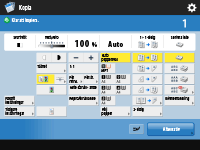 Visar inställningsstatus, t.ex. för reproförhållande, pappersformat, antal kopior osv. Kom ihåg att kontrollera inställningarna här för att kopiera på rätt sätt. För att ändra inställningarna, tryck på knappen under skärmbildsdelen.