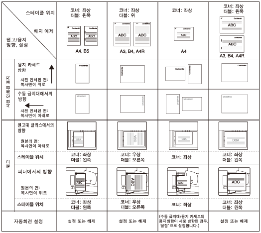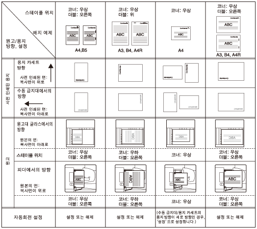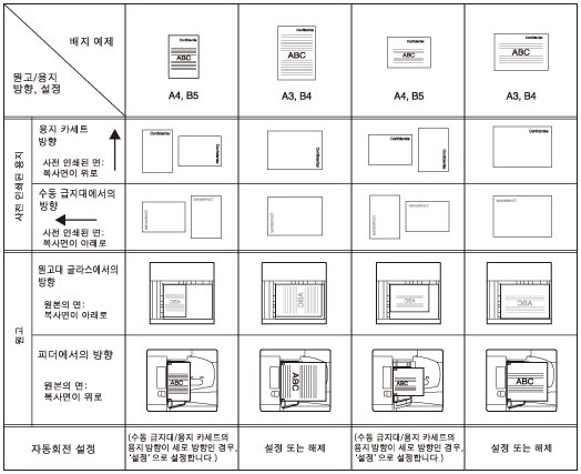 사전 인쇄된 용지에 복사하려는 경우 복사면을 다음과 같이 세트합니다.