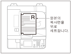 원고를 원고대 유리에 세트할 때와 같은 방향으로 피더에서 방향을 설정하려면 원고의 위쪽이 아래쪽을 향하고 인쇄면이 위로 향하도록 원고를 세트합니다. 하지만 스테이플 모드에 해당하는 용지 크기가 들어 있지 않으면 출력이 자동으로 회전됩니다.