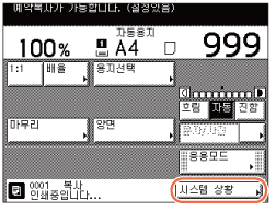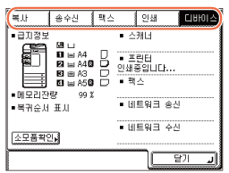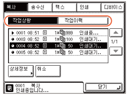 [작업상황], [송신작업 상황] 또는 [수신작업 상황]을 눌러 기기 메모리에 현재 들어 있는 작업을 확인하거나, [작업이력], [송신작업 이력] 또는 [수신작업 이력]을 눌러 기기에서 처리한 작업의 기록을 확인합니다.