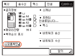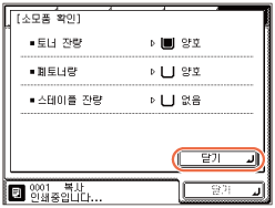 [소모품 확인]을 눌러 토너, 폐토너 및 스테이플의 상황이 표시됩니다.