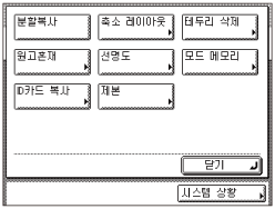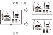 → 분할 복사분할 복사 모드를 선택하거나 취소할 때 누릅니다. 이 모드를 사용하여 책의 펼쳐진 페이지를 각각 다른 복사 용지에 복사할 수 있습니다