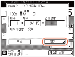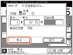 기기가 스캔, 인쇄 또는 인쇄를 대기하는 동안 표시되는 팝업 화면에서 [취소]를 누릅니다. 팝업 화면이 표시되는 동안