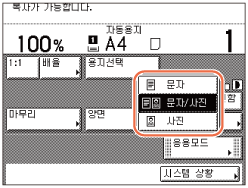 기기가 최대한 원고에 충실하게 복사본을 재현할 수 있도록 원고 종류를 수동으로 선택할 수 있습니다. 다음과 같이 세 가지 원고 종류 모드를 사용할 수 있습니다.