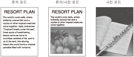 이 모드는 잡지 또는 카탈로그와 같이 문자 및 이미지/사진이 들어 있는 원고를 복사하는 데 가장 적합합니다.